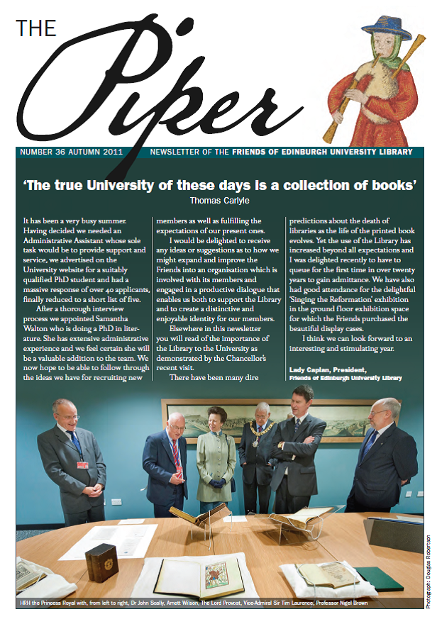 Welcome to the Friends of Edinburgh University Library website. I hope you find not only the information you need but discover something about the wonderful resources we have purchased for the Heritage Collections. Each year we put on several talks and a private visit to a special external Library, and if you would like to be part of this please come along and give us your responses and your ideas. We want the Friends to be an active part of the University Library, and the wider University, as well as a group of people sharing something they enjoy. – Louise Gardiner, President
